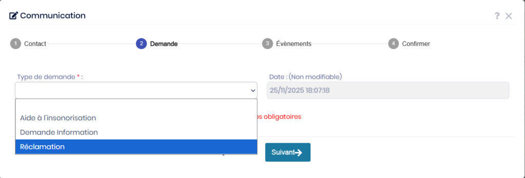 Sélectionner « Réclamation » dans le champ Type de demande puis cliquer sur le bouton Suivant