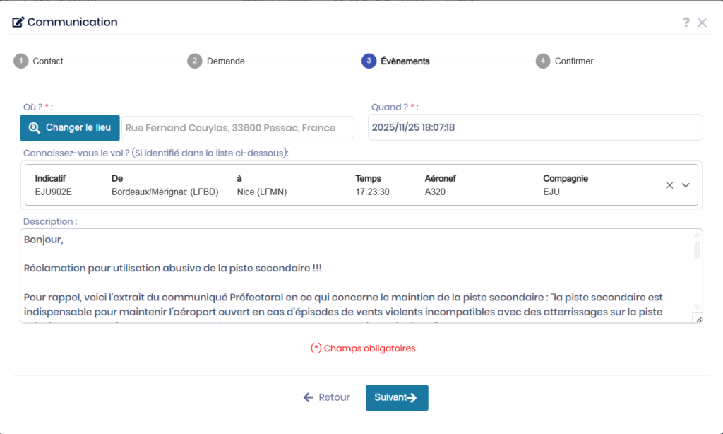 Vérifier le lieu (le changer au besoin), indiquer le vol si vous avez pu l’identifier avec l’application FligthRadar24 par exemple.