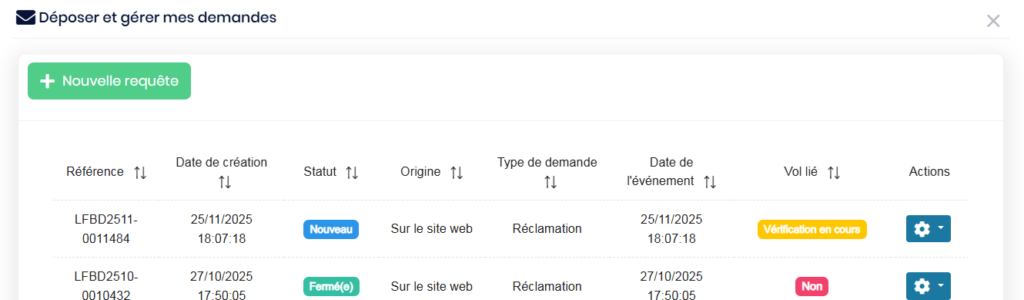 Cliquer sur le bouton Nouvelle requête. Vous retrouvez également toutes vos réclamations précédentes sur cette page.
